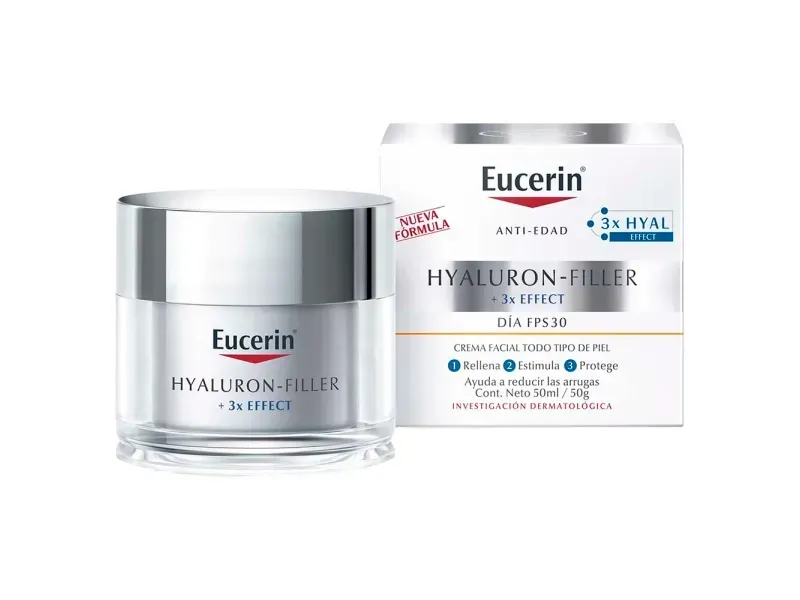 La Crema Facial Eucerin Hyaluron-Filler Día SPF 30 es un tratamiento antiedad avanzado diseñado para reducir visiblemente las arrugas y líneas de expresión mientras protege la piel contra los daños causados por el sol. Ideal para pieles maduras, su fórmula combina ingredientes innovadores para hidratar profundamente, rellenar la piel desde el interior y prevenir los signos del envejecimiento.