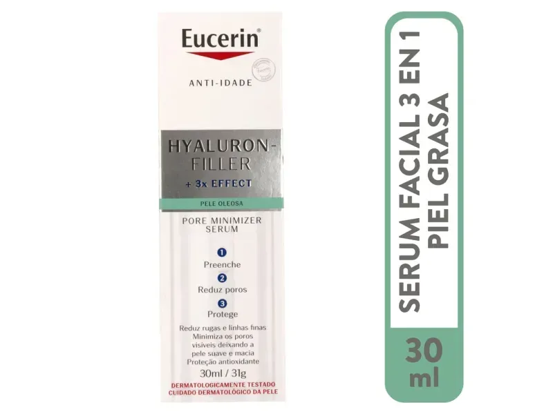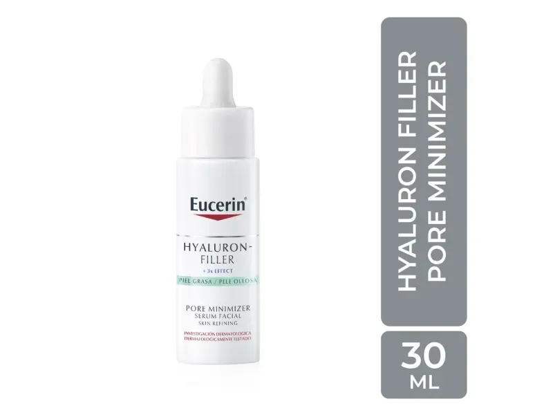 EUCERIN Sérum Facial Minimizador De Poros Hyaluron-Filler Piel Grasa afina los poros y ayuda a reducir las primeras líneas de expresión. Este sérum antiedad de uso diario ayuda a rellenar las arrugas, al tiempo que protege contra las agresiones medioambientales, ya que contiene tres ingredientes activos claves: el ácido hialurónico, el ácido glicólico y el ácido láctico, para dejar la piel sedosa. Textura ultraligera y no grasa.