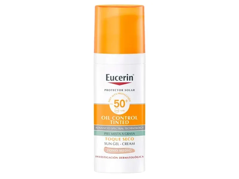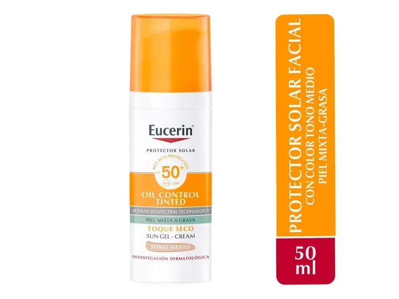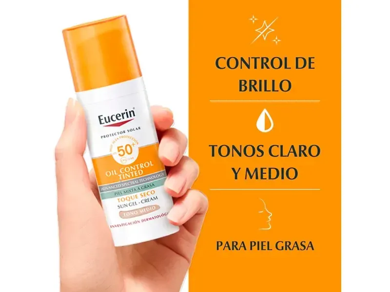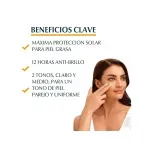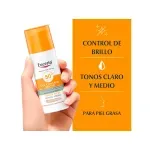 Eucerin Sun Face Oil Control FPS 50+ protege la piel grasa y con tendencia al acné de los daños inducidos por el sol con la Tecnología Espectral Avanzada y la defensa contra la luz HEVIS para una protección UV muy alta, ofreciendo un control de la grasa y el brillo durante 12 horas en tono medio